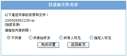 四、文件及目录共享 勾选多个目录或文件后(不点勾选为对整个用户空间操作)点击“共享”图标,出现以下页面: 此处可以对多个目录及文件或根目录进行共享。初次显示的是不共享页面。