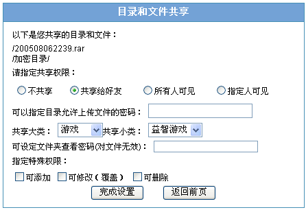 所有人可见:全部访客和注册用户均可以在公共目录和公共文件区域查看到。可选择或不选择管理员设定的共享类别;如果指定文件夹的查看密码,则用户点击目录的时候会弹出一个密码输入框,不正确则不能进入查看;另外可指定此目录中操作是否可以添加、可以修改覆盖、可以删除,若全不选择则只能查看并下载。