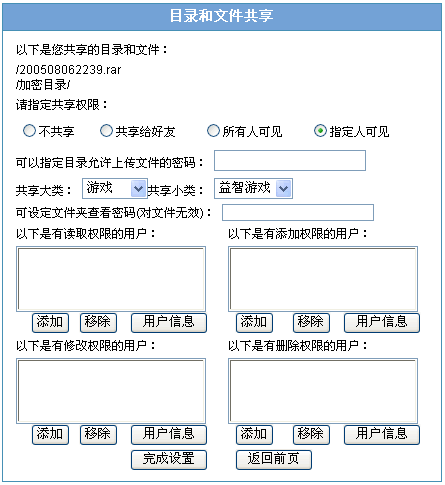指定人可见:指定目录及文件可以查看的多个已注册用户名。可选择或不选择管理员设定的共享类别;如果指定文件夹的查看密码,则用户点击目录的时候会弹出一个密码输入框,不正确则不能进入查看;在此可分别指定读取、添加、修改、删除的用户名称。 |